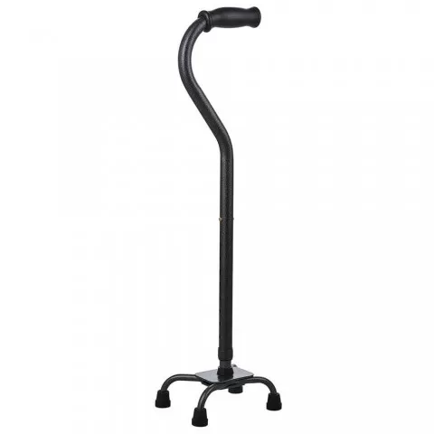Baston ortopedic cu 4 picioare pentru persoane supraponderale, mâner curb acoperit cu burete, reglabil in înălțime, realizat din oțel, baza mica tip plăcută, cu 4 pufere din cauciuc, stabil și sigur in utilizare.