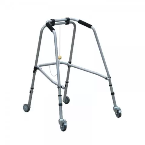 Cadru de mers fix cu 4 roți realizat din aluminiu inoxidabil, ce permite deplasarea in orice direcție iar dacă este necesar, cadrul poate fi blocat prin activarea franelor de la roțile din spate.