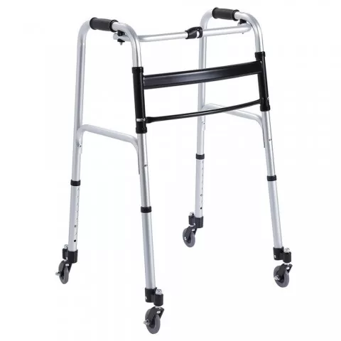 Cadru de mers pliabil cu 4 roți mobile - RP733 - Cadru de mers pliabil realizat din tub de aluminiu anodizat, ajustabil in înălțime, cu 4 roți frontale mobile din cauciuc, pliere ușoară prin apasarea unui mecanism, forma trapez.
