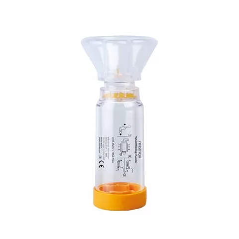 cameră de inhalare antistatica (175 ml) ce îmbunătățește livrarea medicației și reduce pierderile prin reducerea depunerilor de medicament pe pereții camerei