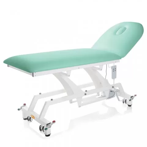 Canapea electrică de consultație realizată pe structură rectangulara din oțel vopsit în alb, reglabila pe înălțime electric și spătar ajustabil electric cu inclinare de până la 60°, saltea din spuma poliuretanica cu densitatea de 25 kg/m3 și înălțime de 8 cm, husa saltea din vinil, material ignifug, ușor de curățat și spalat, pufere din cauciuc pentru a preveni alunecarea.