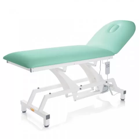 Canapea electrică de consultație realizată pe structură rectangulara din oțel vopsit în alb, reglabila pe înălțime electric și spătar ajustabil electric cu inclinare de până la 60°, saltea din spuma poliuretanica cu densitatea de 25 kg/m3 și înălțime de 8 cm, husa saltea din vinil, material ignifug, ușor de curățat și spalat, pufere din cauciuc pentru a preveni alunecarea.