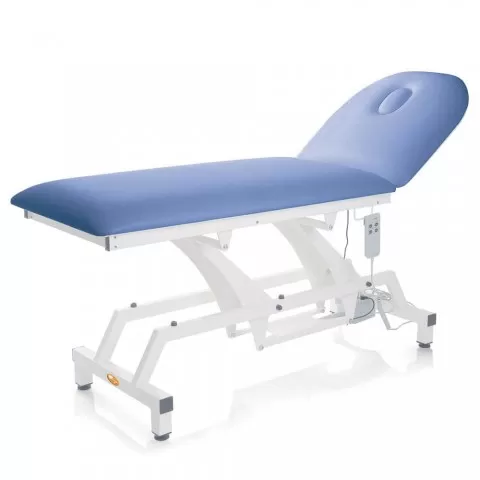 Canapea electrică de consultație realizată pe structură rectangulara din oțel vopsit în alb, reglabila pe înălțime electric și spătar ajustabil electric cu inclinare de până la 60°, saltea din spuma poliuretanica cu densitatea de 25 kg/m3 și înălțime de 8 cm, husa saltea din vinil, material ignifug, ușor de curățat și spalat, pufere din cauciuc pentru a preveni alunecarea.