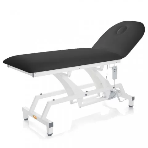Canapea electrică de consultație realizată pe structură rectangulara din oțel vopsit în alb, reglabila pe înălțime electric și spătar ajustabil electric cu inclinare de până la 60°, saltea din spuma poliuretanica cu densitatea de 25 kg/m3 și înălțime de 8 cm, husa saltea din vinil, material ignifug, ușor de curățat și spalat, pufere din cauciuc pentru a preveni alunecarea.