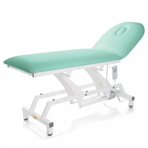Canapea electrică de consultație realizată pe structură rectangulara din oțel vopsit în alb, reglabila pe înălțime electric și spătar ajustabil electric cu inclinare de până la 60°, saltea din spuma poliuretanica cu densitatea de 25 kg/m3 și înălțime de 8 cm, husa saltea din vinil, material ignifug, ușor de curățat și spalat, pufere din cauciuc pentru a preveni alunecarea.