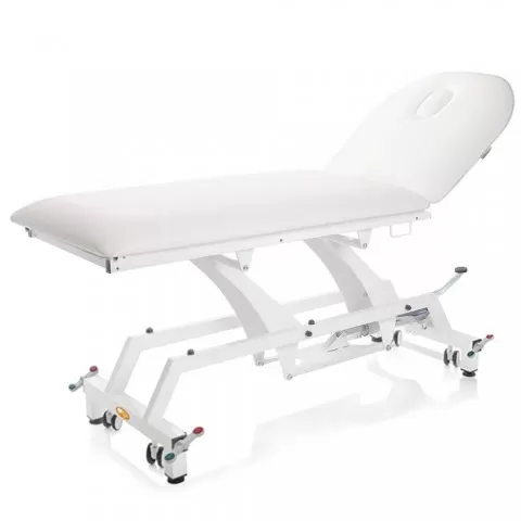 • Canapea hidraulica de consultație realizată pe structură tubulară din oțel vopsit în alb, reglabila pe înălțime hidraulic și spătar ajustabil pneumatic cu inclinare de 60°, saltea din spuma poliuretanica cu densitatea de 25 kg/m3 și înălțime de 8 cm, husa saltea din vinil, material ignifug, ușor de curățat și spalat, pufere din cauciuc pentru a preveni alunecarea.