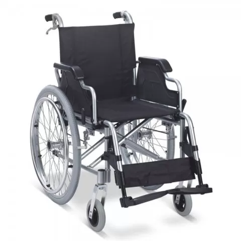 Cărucior cu roțile, mâner pe doua nivele, actionare manuala - FS908LJ-46 - Cărucior cu roțile pentru transport persoane cu dizabilități. Beneficii și avantaje:realizat pe cadru din aluminiu dublat (întărit).cu antrenare manuala.buzunar spate pentru transportul actelor.cotiera rabatabila și reglabila...