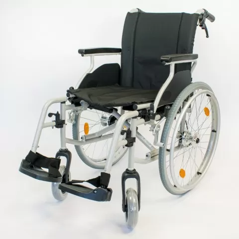 Cărucior cu roțile pentru transport pacienti adulti cu handicap, realizat pe cadru din aluminiu de culoare gri, disponibil in mai multe variante de șezut: 39 cm, 42 cm, 45 cm și 48 cm.