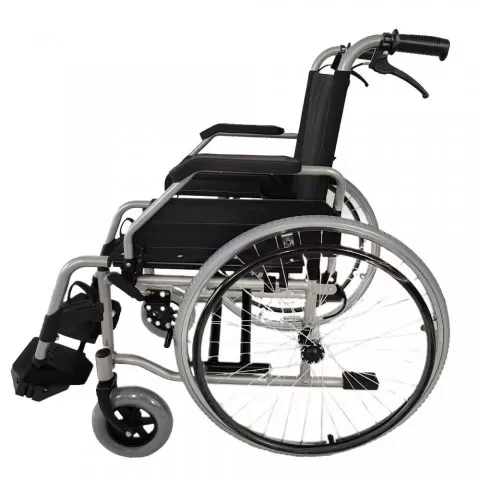 care pot fi actionate independent de catre utilizator. prevazut cu curea de siguranță.Șezutul și spătarul pliabil sunt confectionate din tesatura Oxford moale de culoare neagră.Suportul de brat este rabatabil pentru a facilita transferul utilizatorului din și in cărucior.Suportul pentru picioare este detașabil.