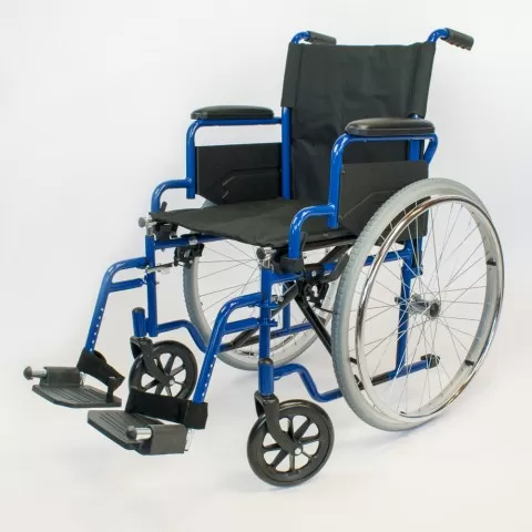 Cărucior cu roțile pliabil pentru transport pacienti adulti cu handicap, construit pe cadru din oțel vopsit de culoare albastră, disponibil in mai multe variante de șezut: 43 cm și 45 cm.