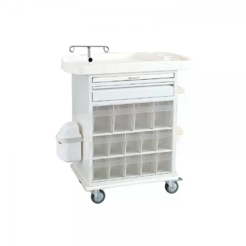 Troliu cu top din ABS din material ușor de curățat și rezistent cu 4 compartimente pentru solutii, pe ambele parti exista un cvartet și două seturi de cate 5 cutii pentru medicamente construite din plexiglas transparent prezinta de asemenea și un raft și sertar glisant pentru prepararea medicamentelor.