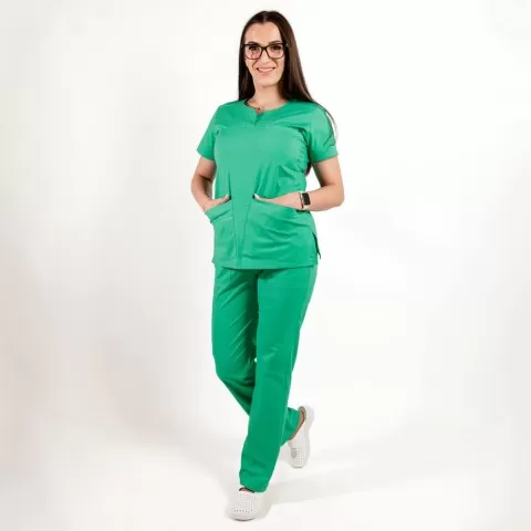 Costum medical Lotus Flex, stretch, verde chirurgical deschis, CVC-NP3 CVC-SP2 este un costum medical conceput pentru activitatea zilnică, cu accent pe confort, durabilitate și întreținere ușoară.