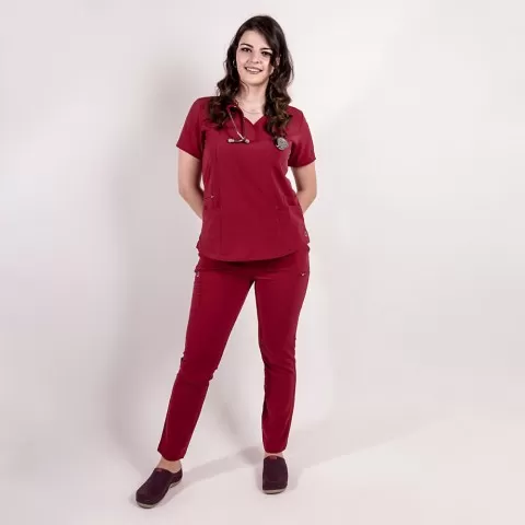 Costum medical Lotus Flex, stretch, visiniu, TS-NP7 TS-SP3 este un costum medical conceput pentru activitatea zilnică, cu accent pe confort, durabilitate și întreținere ușoară.