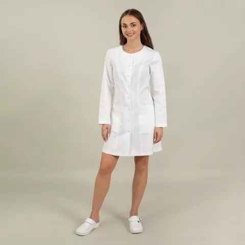 Halat medical alb 3/4 cu guler rotund - Ema este un halat medical conceput pentru confort, aspect îngrijit și utilizare frecventă în medii profesionale.