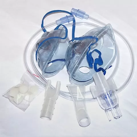 Kit-ul conține: masca adult, masca copil, tub, nebulizator, 5 filtre, piesă de nas, piesă de gură.