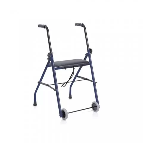 Rolator pliabil realizat din oțel vopsit, culoare bleumarin, stabil, ușor de utilizat, cu mânere ergonomice reglabile in înălțime, cu doua roți fixe in față și scaun pentru odihna.