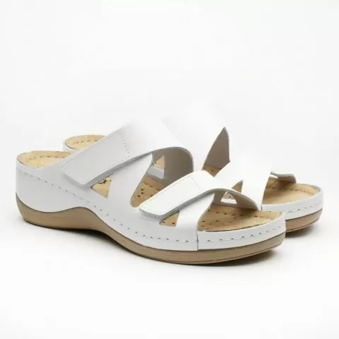 Saboți damă, de vară, din piele, inchidere cu scai, Leon 906, alb - saboții de damă Leon sunt potriviți în garderoba feminină. Saboții de vară Leon sunt confecționați din piele naturală 100% atât la interior, cât și la exterior, oferind confort ridicat și menținând picioarele uscate în zilele călduroase. Talpa interioară are gel cu memorie și menține confortul chiar și atunci când petreci multe ore în picioare sau mergi distanțe mari pe jos.