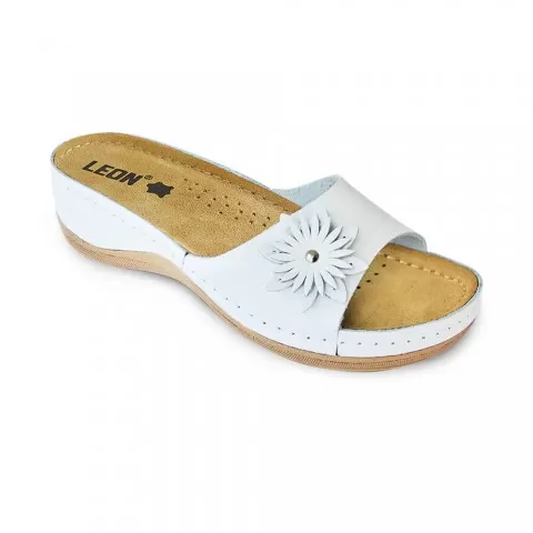 Saboți damă, de vară, din piele naturală, Leon 915, alb - saboții de damă Leon sunt potriviți în garderoba feminină. Saboții de vară Leon sunt confecționați din piele naturală 100% atât la interior, cât și la exterior, oferind confort ridicat și menținând picioarele uscate în zilele călduroase. Talpa interioară are gel cu memorie și menține confortul chiar și atunci când petreci multe ore în picioare sau mergi distanțe mari pe jos.
