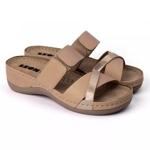 Saboți damă, din piele, de vară, Leon 909, bej - saboții de damă Leon sunt potriviți în garderoba feminină. Saboții de vară Leon sunt confecționați din piele naturală 100% atât la interior, cât și la exterior, oferind confort ridicat și menținând picioarele uscate în zilele călduroase. Talpa interioară are gel cu memorie și menține confortul chiar și atunci când petreci multe ore în picioare sau mergi distanțe mari pe jos.