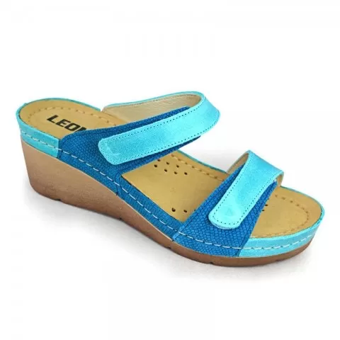 Saboți Leon 1040, de vară, din piele, turcoaz - saboții de damă Leon sunt potriviți în garderoba feminină. Saboții de vară Leon sunt confecționați din piele naturală 100% atât la interior, cât și la exterior, oferind confort ridicat și menținând picioarele uscate în zilele călduroase. Talpa interioară are gel cu memorie și menține confortul chiar și atunci când petreci multe ore în picioare sau mergi distanțe mari pe jos.