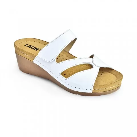 Saboți Leon 1055, de vară, din piele, alb - saboții de damă Leon sunt potriviți în garderoba feminină. Saboții de vară Leon sunt confecționați din piele naturală 100% atât la interior, cât și la exterior, oferind confort ridicat și menținând picioarele uscate în zilele călduroase. Talpa interioară are gel cu memorie și menține confortul chiar și atunci când petreci multe ore în picioare sau mergi distanțe mari pe jos.