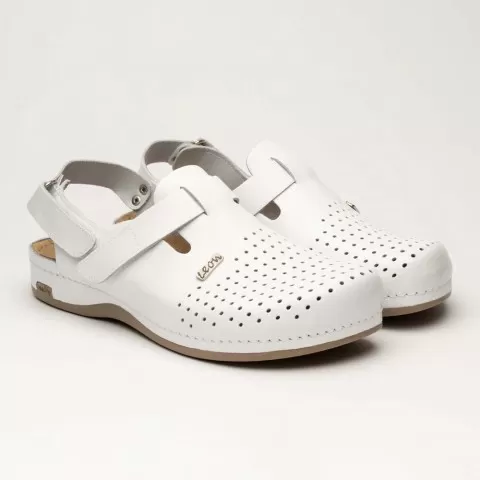 Saboți medicali, de bărbați, din piele, alb, Leon 701M - saboții Leon sunt recomandați pentru activități profesionale desfășurate în clinici private, spitale, centre de îngrijire medicală sau saloane de coafură și centre estetice, în industria farmaceutică, industria alimentară, horeca, servicii de curățenie, grădinițe și nu numai, respectând standarde ridicate de calitate.