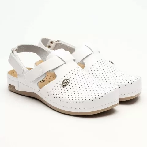 Saboți medicali, de damă, din piele, alb, Leon 951 - saboții Leon sunt recomandați pentru activități profesionale desfășurate în clinici private, spitale, centre de îngrijire medicală sau saloane de coafură și centre estetice, în industria farmaceutică, industria alimentară, horeca, servicii de cură...