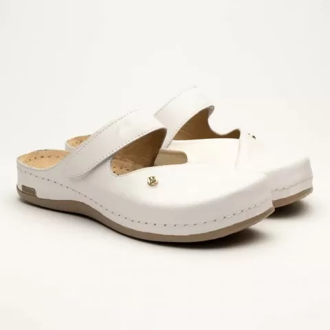 Saboți medicali, de damă, din piele, alb, Leon 953 - saboții de damă Leon sunt potriviți în garderoba feminină. Saboții Leon sunt confecționați din piele naturală 100% atât la interior, cât și la exterior, oferind confort ridicat și menținând picioarele uscate pe tot parcursul zilei. Talpa interioară are gel cu memorie și menține confortul chiar și atunci când petreci multe ore în picioare sau mergi distanțe mari pe jos.