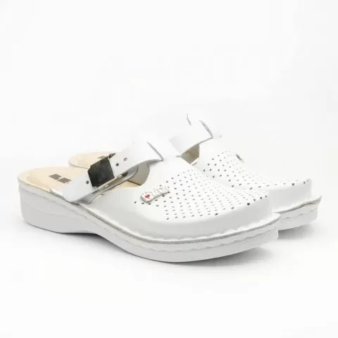 Saboți medicali, de damă, din piele, alb, Leon V260 - saboții Leon sunt recomandați pentru activități profesionale desfășurate în clinici private, spitale, centre de îngrijire medicală sau saloane de coafură și centre estetice, în industria farmaceutică, industria alimentară, horeca, servicii de curățenie, grădinițe și nu numai, respectând standarde ridicate de calitate.