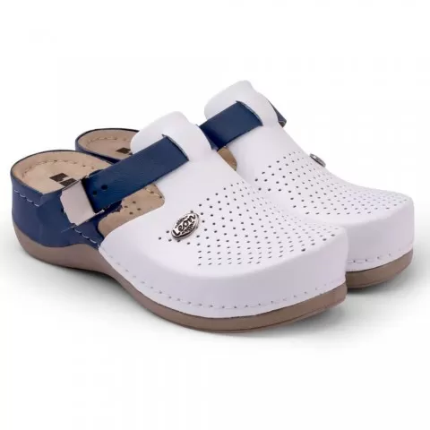 Saboți medicali, de damă, din piele, alb/bleumarin, Leon 901 - saboții Leon sunt recomandați pentru activități profesionale desfășurate în clinici private, spitale, centre de îngrijire medicală sau saloane de coafură și centre estetice, în industria farmaceutică, industria alimentară, horeca, servicii de curățenie, grădinițe și nu numai, respectând standarde ridicate de calitate.