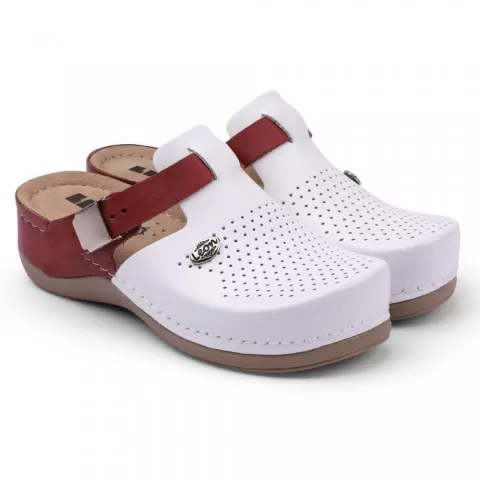 Saboți medicali, de damă, din piele, alb/bordo, Leon 901 - saboții Leon sunt recomandați pentru activități profesionale desfășurate în clinici private, spitale, centre de îngrijire medicală sau saloane de coafură și centre estetice, în industria farmaceutică, industria alimentară, horeca, servicii de curățenie, grădinițe și nu numai, respectând standarde ridicate de calitate.
