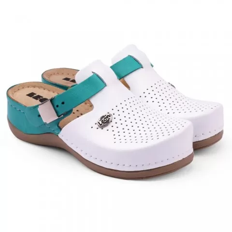 Saboți medicali, de damă, din piele, alb/turcoaz, Leon 901 - saboții Leon sunt recomandați pentru activități profesionale desfășurate în clinici private, spitale, centre de îngrijire medicală sau saloane de coafură și centre estetice, în industria farmaceutică, industria alimentară, horeca, servicii...