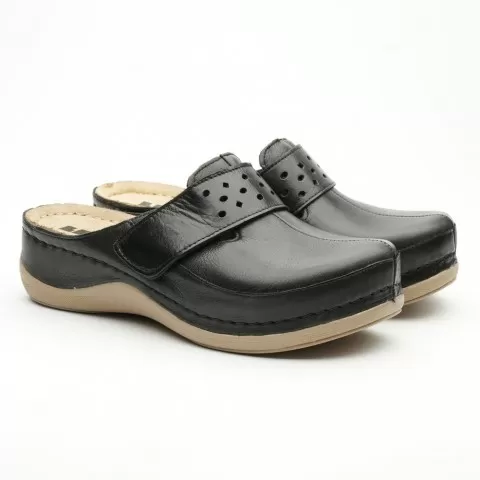 Saboți medicali, de damă, din piele, negru, Leon 902 - saboții Leon sunt recomandați pentru activități profesionale desfășurate în clinici private, spitale, centre de îngrijire medicală sau saloane de coafură și centre estetice, în industria farmaceutică, industria alimentară, horeca, servicii de cu...