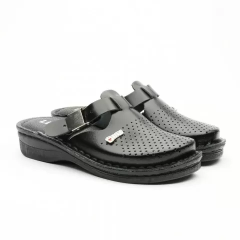 Saboți medicali, de damă, din piele, negru, Leon V260 - saboții Leon sunt recomandați pentru activități profesionale desfășurate în clinici private, spitale, centre de îngrijire medicală sau saloane de coafură și centre estetice, în industria farmaceutică, industria alimentară, horeca, servicii de curățenie, grădinițe și nu numai, respectând standarde ridicate de calitate.