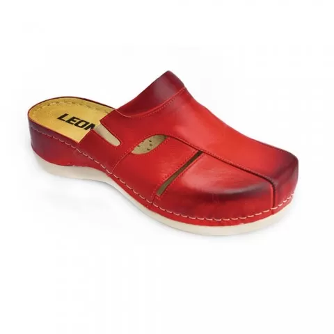 Saboți medicali, de damă, din piele, roșu, Leon 925 - saboții Leon sunt recomandați pentru activități profesionale desfășurate în clinici private, spitale, centre de îngrijire medicală sau saloane de coafură și centre estetice, în industria farmaceutică, industria alimentară, horeca, servicii de curățenie, grădinițe și nu numai, respectând standarde ridicate de calitate.