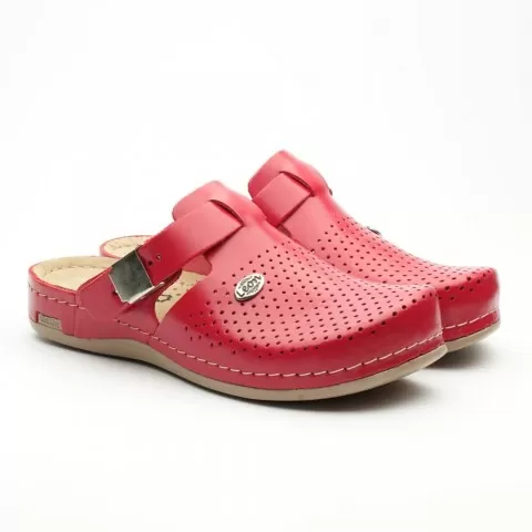 Saboți medicali, de damă, din piele, roșu, Leon 950 - saboții Leon sunt recomandați pentru activități profesionale desfășurate în clinici private, spitale, centre de îngrijire medicală sau saloane de coafură și centre estetice, în industria farmaceutică, industria alimentară, horeca, servicii de curățenie, grădinițe și nu numai, respectând standarde ridicate de calitate.
