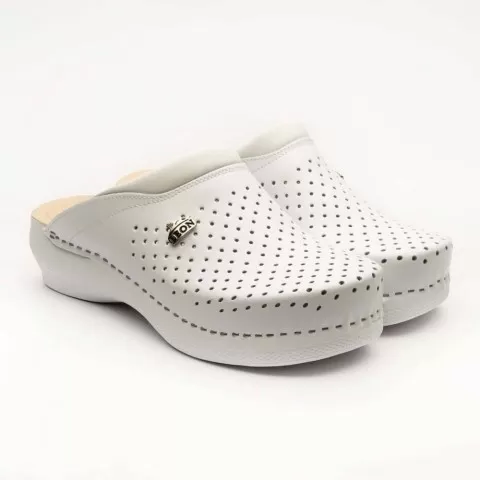 Saboți medicali, unisex, din piele, alb, Leon PU100 - saboții medicali Leon sunt fabricați din piele naturală 100% atât la interior, cât și la exterior, oferind un confort sporit și contribuind la mentinerea picioarelor uscate pe tot parcursul zilei. Talpa este de asemenea confortabilă în zilele în care petreci multe ore în picioare sau cand parcurgi distanțe mai lungi pe jos. Brandul Leon oferă o gama variată de saboți și sandale din piele, atât pentru femei, cât și pentru bărbați. Nuantele colorate sau neutre sunt bine alese, pentru a putea accesoriza cu succes tinuta ta.