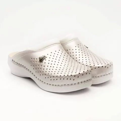 Saboți medicali, unisex, din piele, alb perlat, Leon PU100 - saboții medicali Leon sunt fabricați din piele naturală 100% atât la interior, cât și la exterior, oferind un confort sporit și contribuind la mentinerea picioarelor uscate pe tot parcursul zilei. Talpa este de asemenea confortabilă în zil...