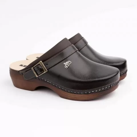 Saboți medicali, unisex, din piele neperforata, maro, Leon PU101 - saboții medicali Leon sunt fabricați din piele naturală 100% atât la interior, cât și la exterior, oferind un confort sporit și contribuind la mentinerea picioarelor uscate pe tot parcursul zilei. Talpa este de asemenea confortabilă în zilele în care petreci multe ore în picioare sau cand parcurgi distanțe mai lungi pe jos. Brandul Leon oferă o gama variată de saboți și sandale din piele, atât pentru femei, cât și pentru bărbați. Nuantele colorate sau neutre sunt bine alese, pentru a putea accesoriza cu succes tinuta ta.