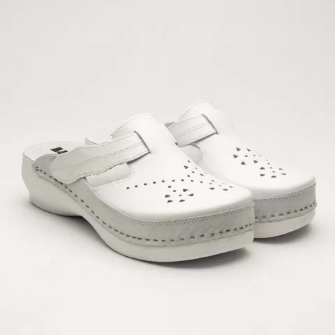 Saboți medicali de damă, din piele, Leon PU156, alb - saboții medicali LEON sunt potriviți pentru mediile profesionale, de la clinici private, spitale și centre de îngrijire medicală până la saloane de coafură și centre estetice. Respectă standarde ridicate de calitate, fiind confecționați din piele naturală 100% atât la interior, cât și la exterior, cu o tehnologie inovatoare menită să sporească gradul de confort. Perforațiile de ventilare din pielea permeabilă permit piciorului să respire liber și astfel să rămână uscat tot timpul zilei;