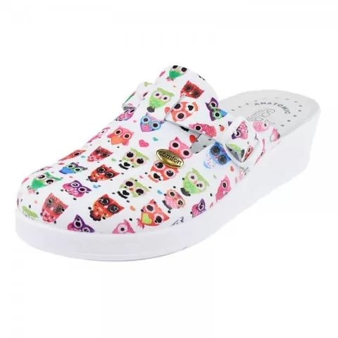 Saboți medicali din piele, cu bufnițe - Goldenfit 708/L - linia de saboți din gama GOLDENFIT este concepută pentru toate mediile profesionale, de la clinici private, spitale și centre de îngrijire medicală până la saloane de coafură și centre estetice.
