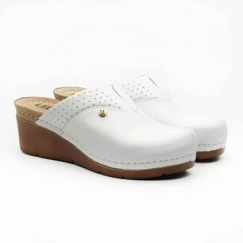 Saboți medicali Leon 1002, de damă, din piele, alb - saboții Leon sunt recomandați pentru activități profesionale desfășurate în clinici private, spitale, centre de îngrijire medicală sau saloane de coafură și centre estetice, în industria farmaceutică, industria alimentară, horeca, servicii de curățenie, grădinițe și nu numai, respectând standarde ridicate de calitate.