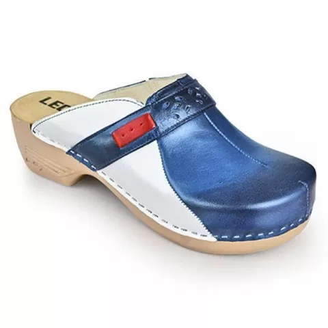 Saboți ortopedici damă, din piele, albastru și alb, Leon PU154 - saboții Leon sunt recomandați pentru activități profesionale desfășurate în clinici private, spitale, centre de îngrijire medicală sau saloane de coafură și centre estetice, în industria farmaceutică, industria alimentară, horeca, servicii de curățenie, grădinițe și nu numai, respectând standarde ridicate de calitate.