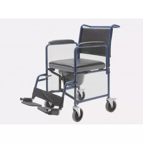 Scaun toaleta cu roți realizat pe cadru de otel vopsit, dotat cu recipient WC, pliabil pentru transport și depozitare ușoară, sezutul și spatarul realizate din material sintetic moale de culoare neagra lavabil, suport picioare și cotiere detașabile, roți spate prevăzute cu frână.