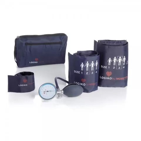 Tensiometru mecanic MORETTI cu manometru la para și trei manșete- DM342: Domeniul de măsurare: 0 - 300 mm Hg. Precizie: ± 3 mm Hg. Manometru cu diametrul de 60 mm. Manșeta din nylon cu marcaj de pozitionare pe artera, sistem de prindere tip “velcro” și inel metalic pentru fixarea comodă pe braț. Manometru cromat, cu grad înalt de prelucrare, asigurand un reglaj fin al debitului de aer evacuat, deflație ușoară 2/3 mm Hg/s.