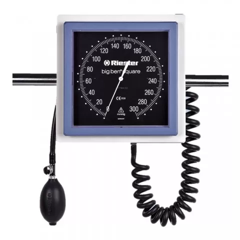 Tensiometru mecanic de perete Riester big ben®, cu cadran pătrat, cu manșeta pentru adulți cu 2 tuburi și inchiderea de tip bandaj, carlig sau scai (velcro). In special pentru anestezie, modelul big ben® este un ajutor de încredere. Ecranul manometrului este de forma pătrată, cu dimensiunea generoasa de 147,2 mm, cadran și indicator cu design optimizat pentru o mai bună lizibilitate a valorilor. Vă rugăm sa alegeți una din variantele de suport ale tensiometrului big ben®: de masa, de perete, pe șină sau pe stativ.