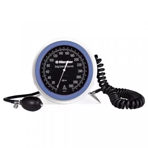 • Tensiometru mecanic de perete Riester big ben®, cu cadran rotund, cu manșeta pentru adulți cu 2 tuburi și inchiderea de tip bandaj, carlig sau scai (velcro). In special pentru anestezie, modelul big ben® este un ajutor de încredere. Ecranul manometrului este de forma rotunda, cu dimensiunea generoasa de 147,2 mm, cadran și indicator cu design optimizat pentru o mai bună lizibilitate a valorilor. Vă rugăm sa alegeți una din variantele de suport ale tensiometrului big ben®: de masa, de perete, pe șină sau pe stativ.