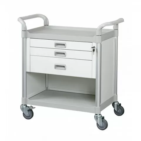• Troliu cu top din PP ușor de curățat și rezistent, cu 3 sertare pentru medicamente cu incuiere centralizata și un raft deschis. Structură din aluminiu este rezistentă la coroziune, lavabilă, ușor de curățat și dezinfectat.